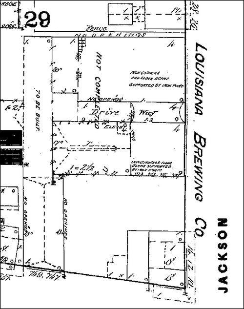 1880’s Sanborn insurance map section showing Louisiana Brewing Co. during construction.